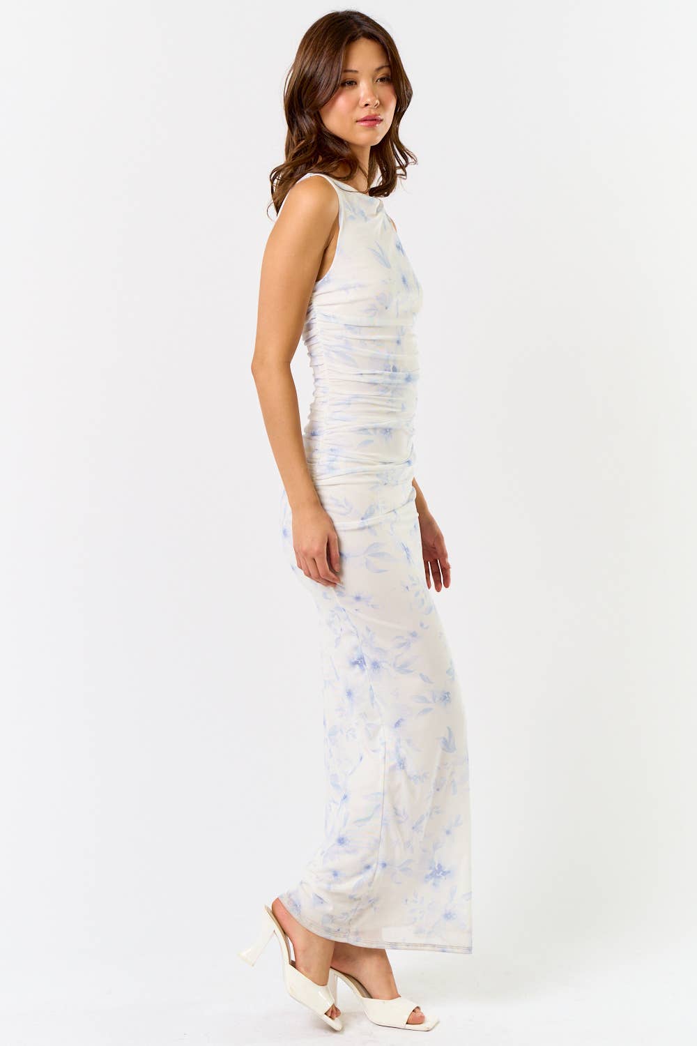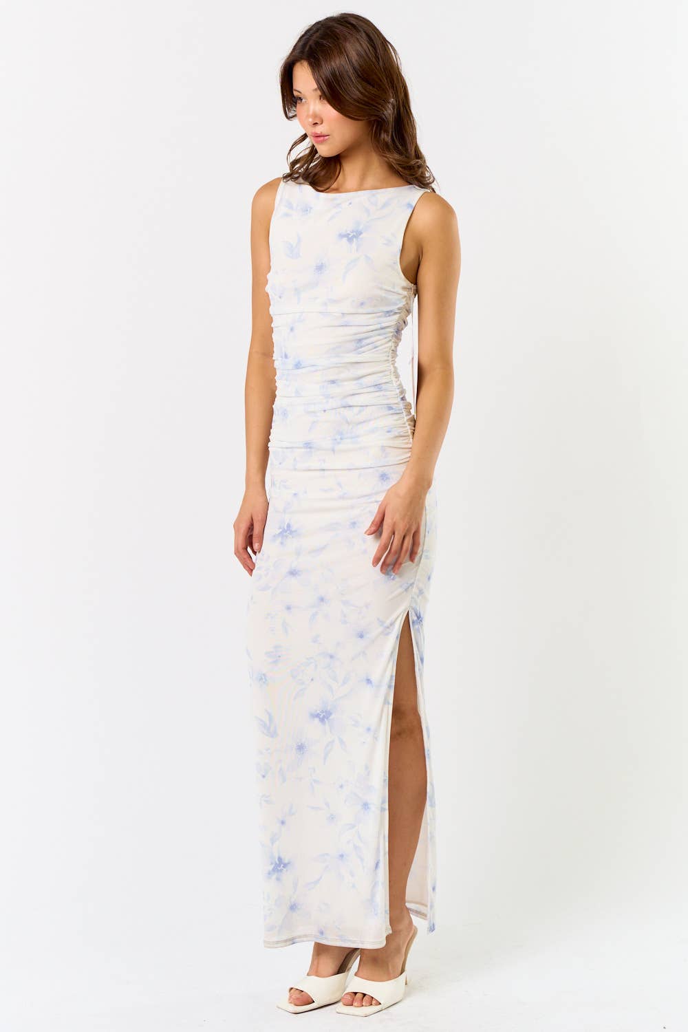 SLEEVELESS RUCHING MIDI DRESS W/SIDE SLIT
