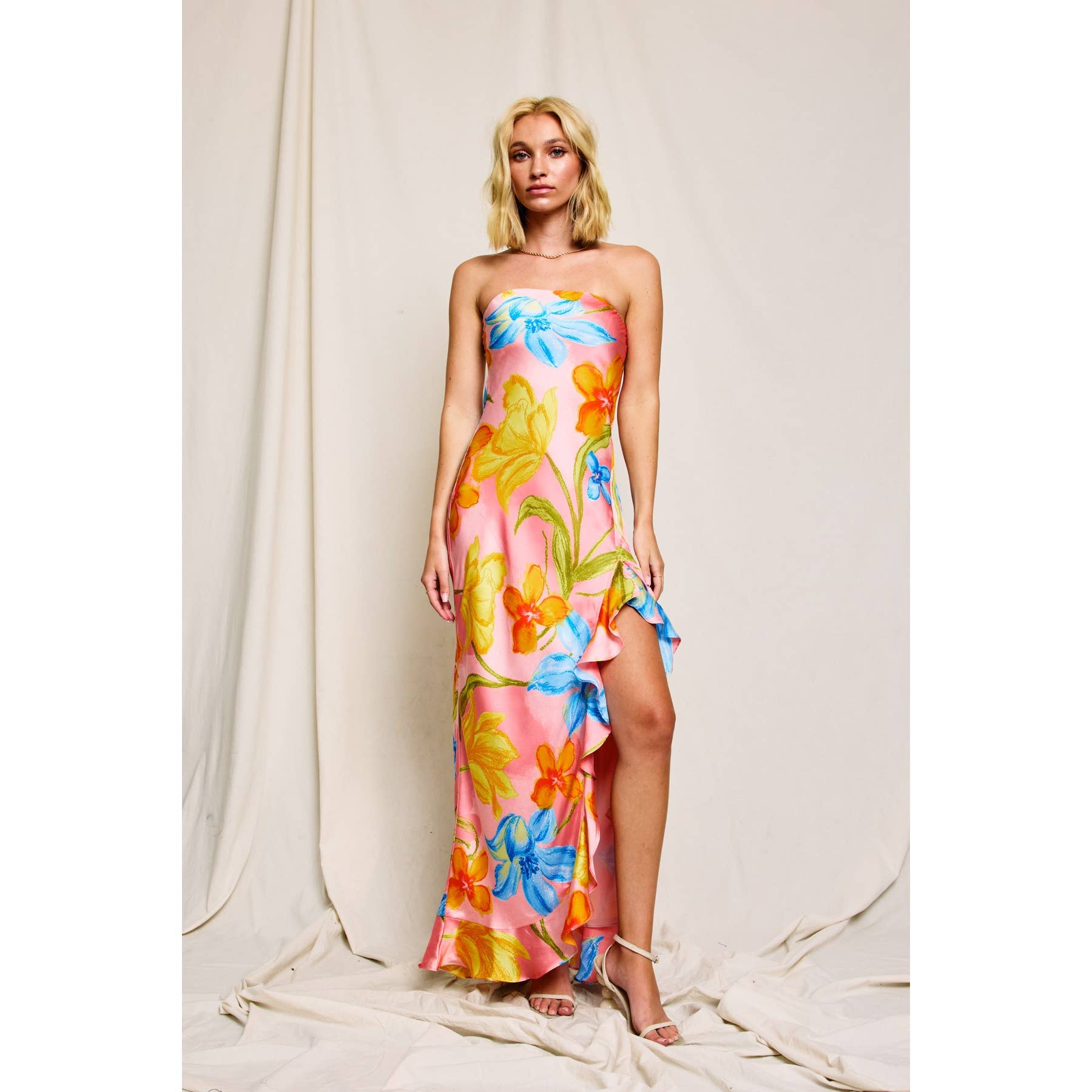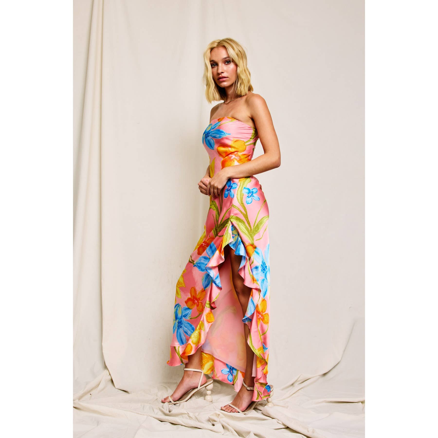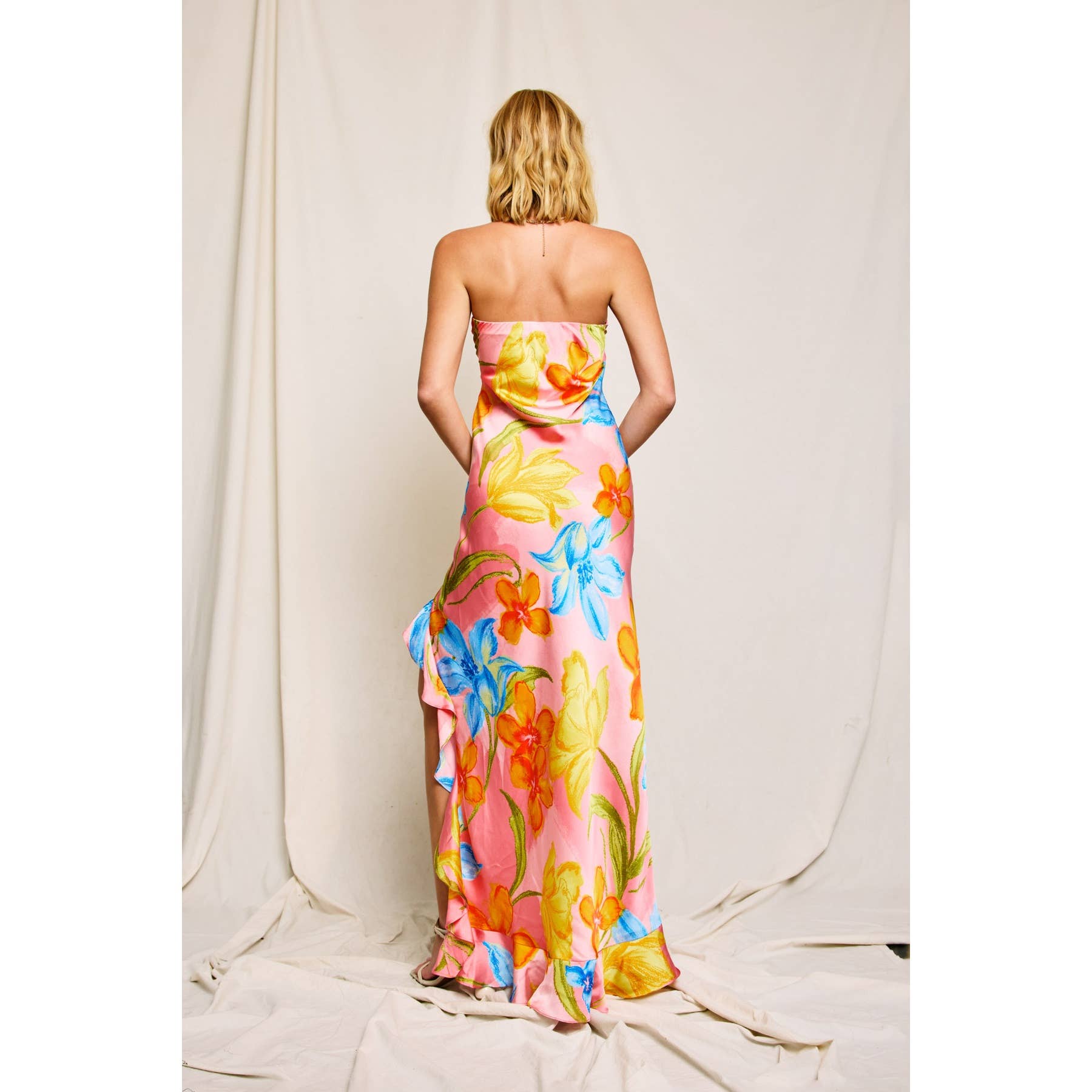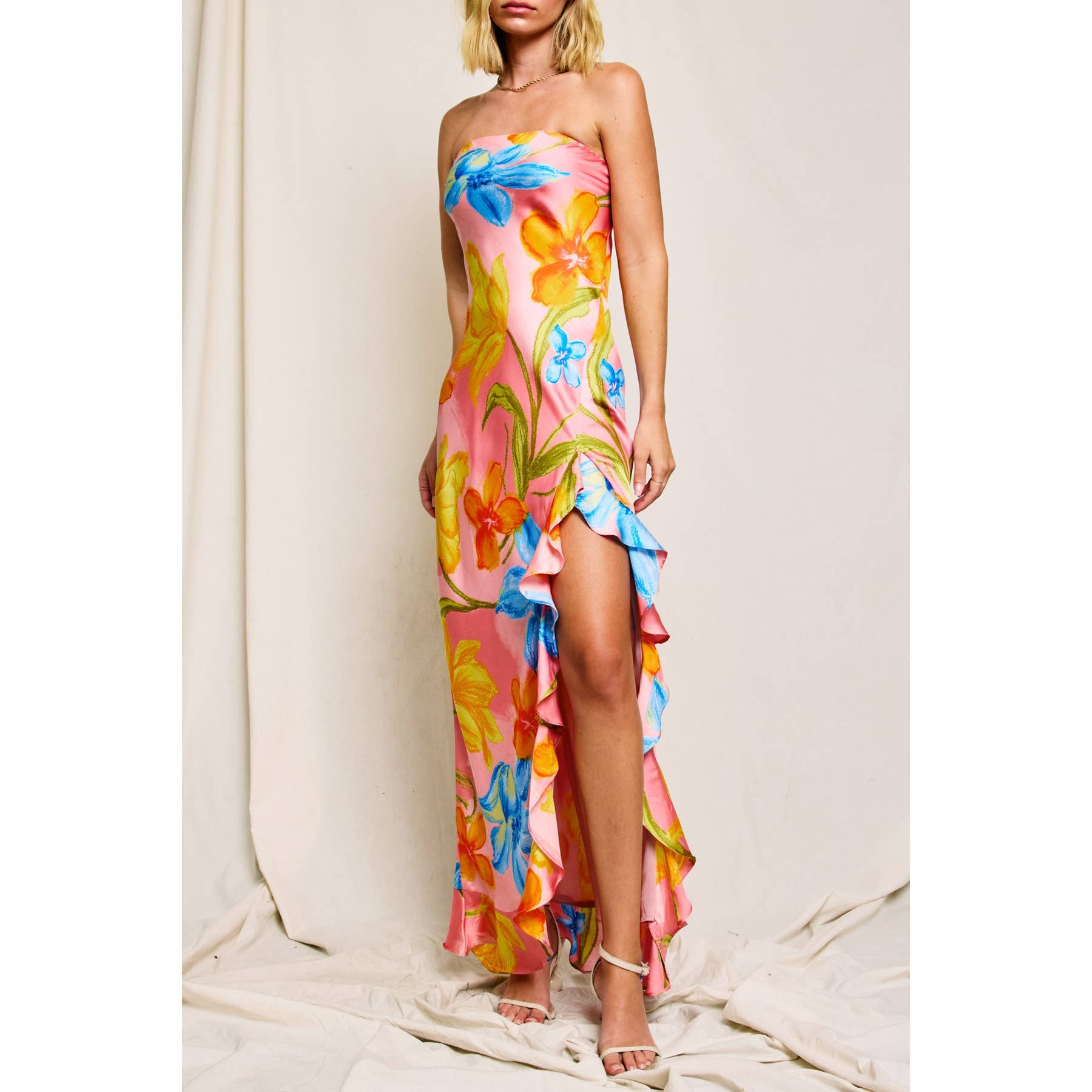 Turn heads in this effortlessly elegant floral satin maxi dress. Designed with a flattering strapless neckline enhanced by an elastic band and gel grip tape for a secure fit, this silhouette shines with feminine flair. The bias-cut fabric offers subtle stretch and a graceful drape, while the ruffled side slit and hem add playful movement and charm. Lined for comfort and crafted in a luxurious floral print, it’s perfect for weddings, garden parties, or sunset soirées.