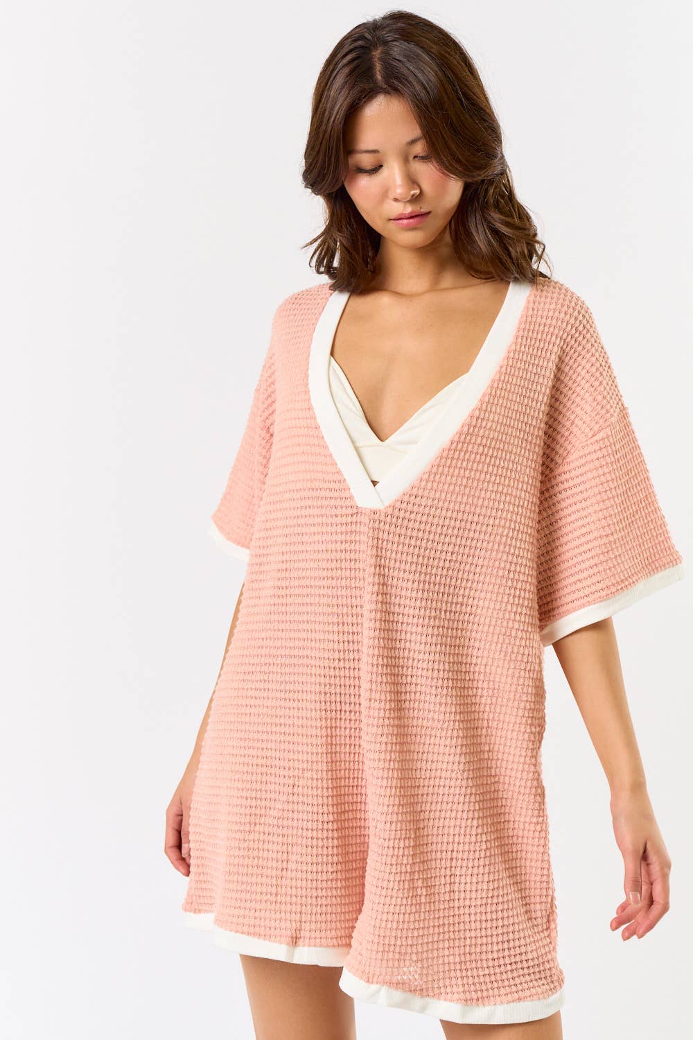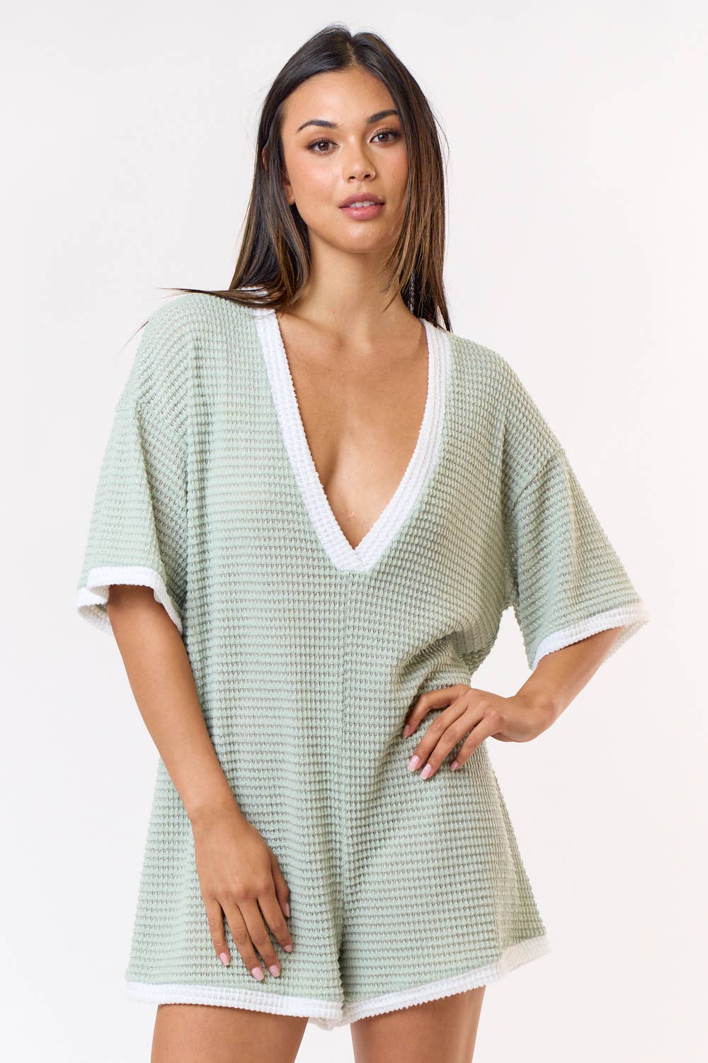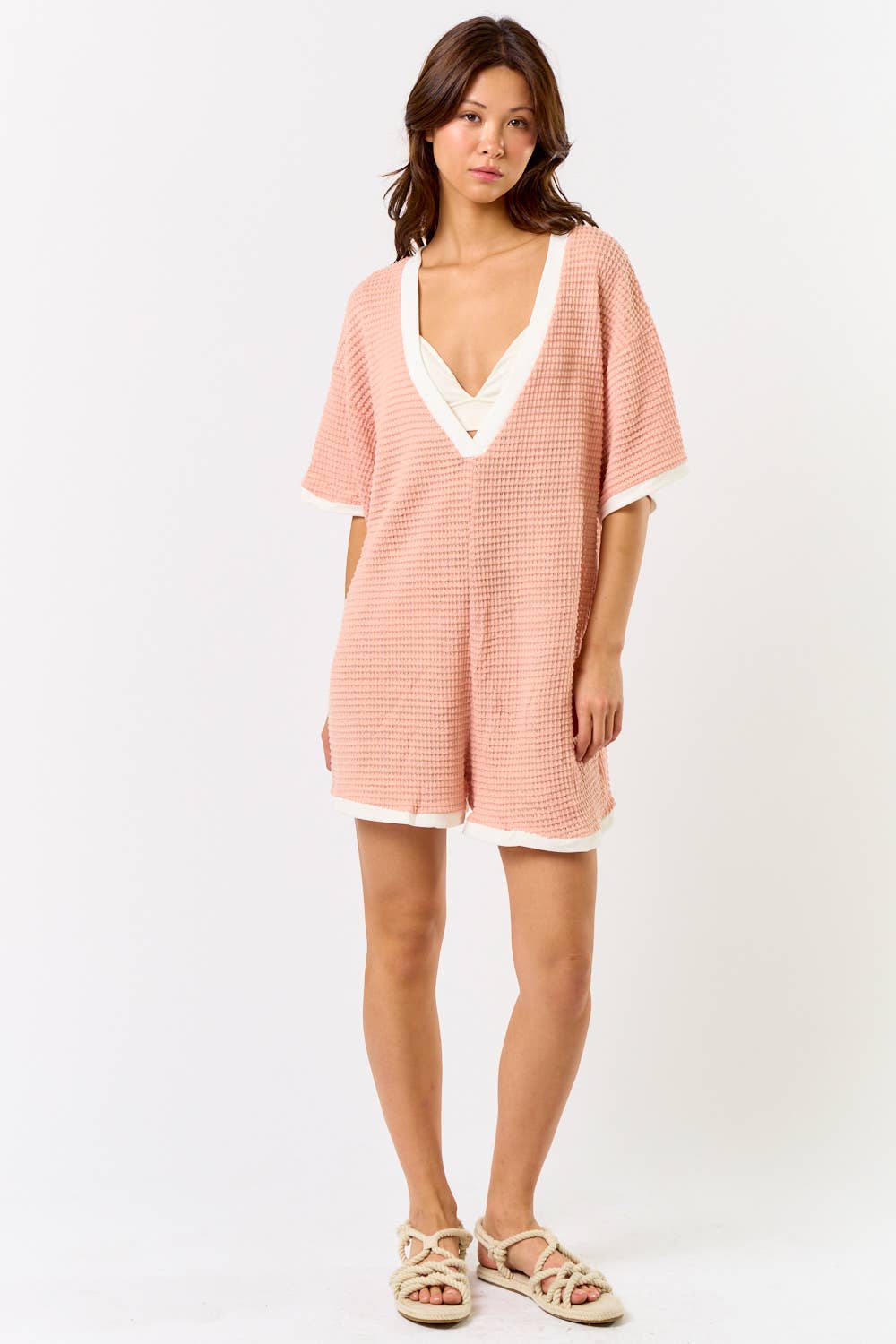CROCHET OPEN KNIT CONTRAST DEEP V-NECK ROMPER