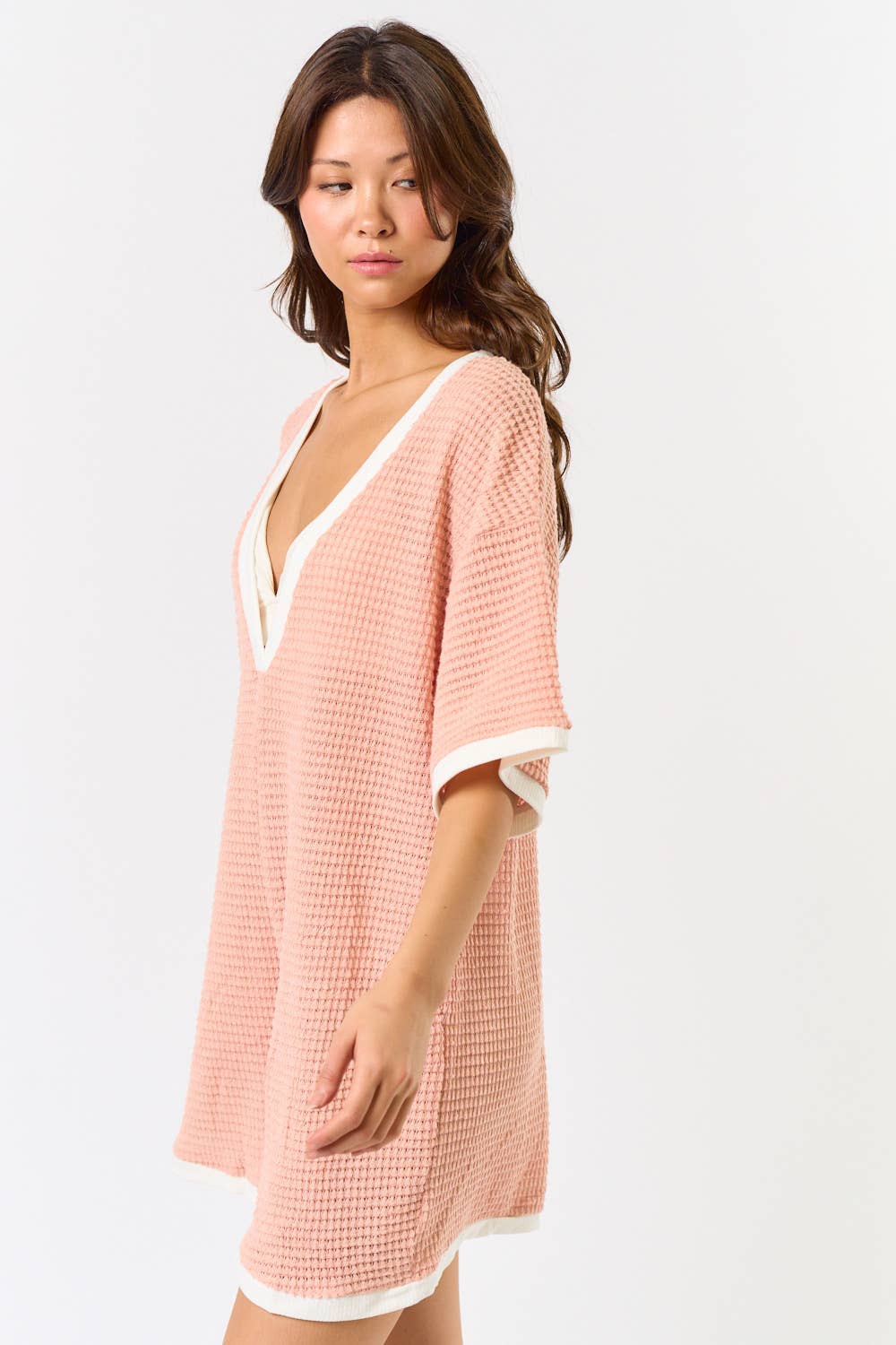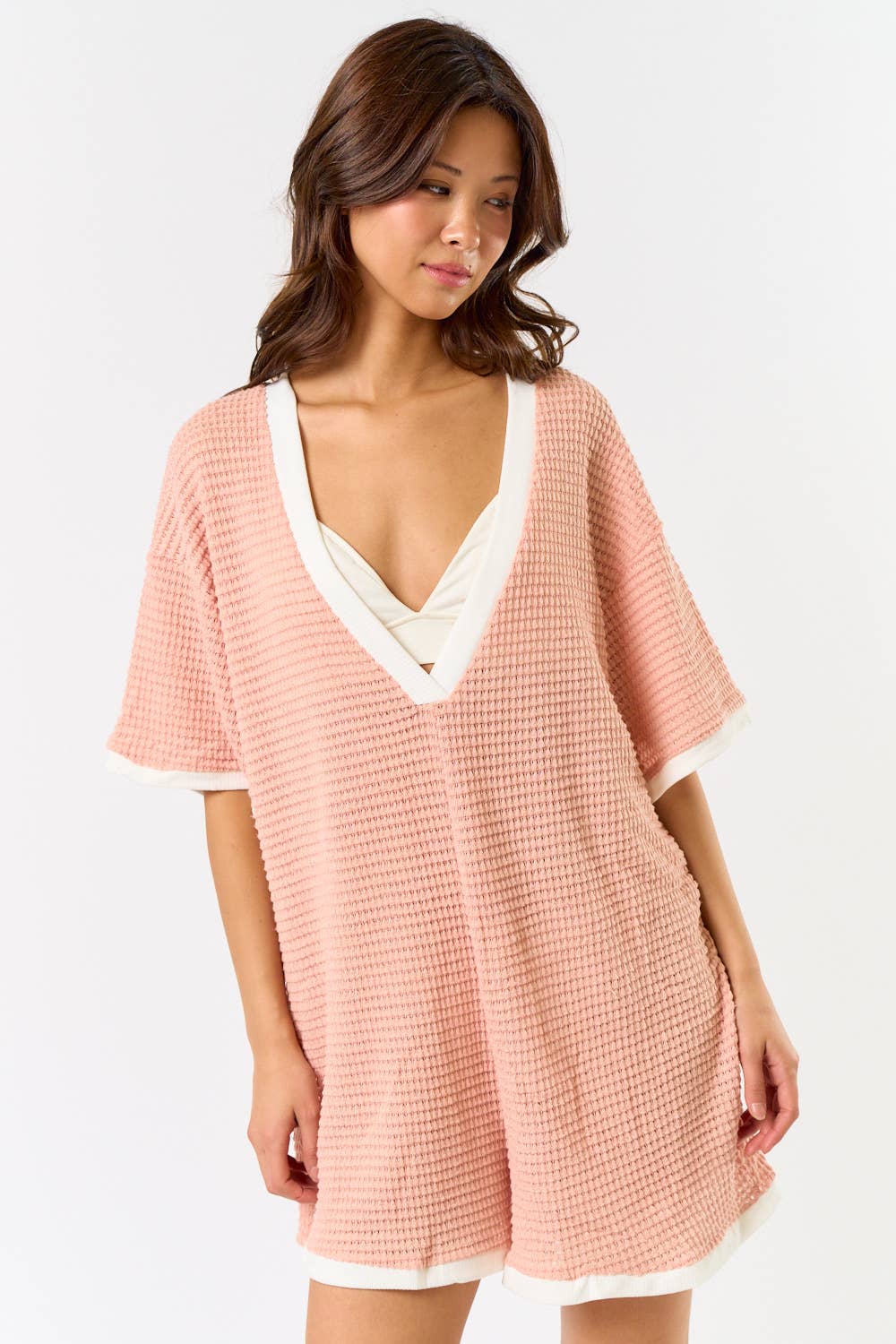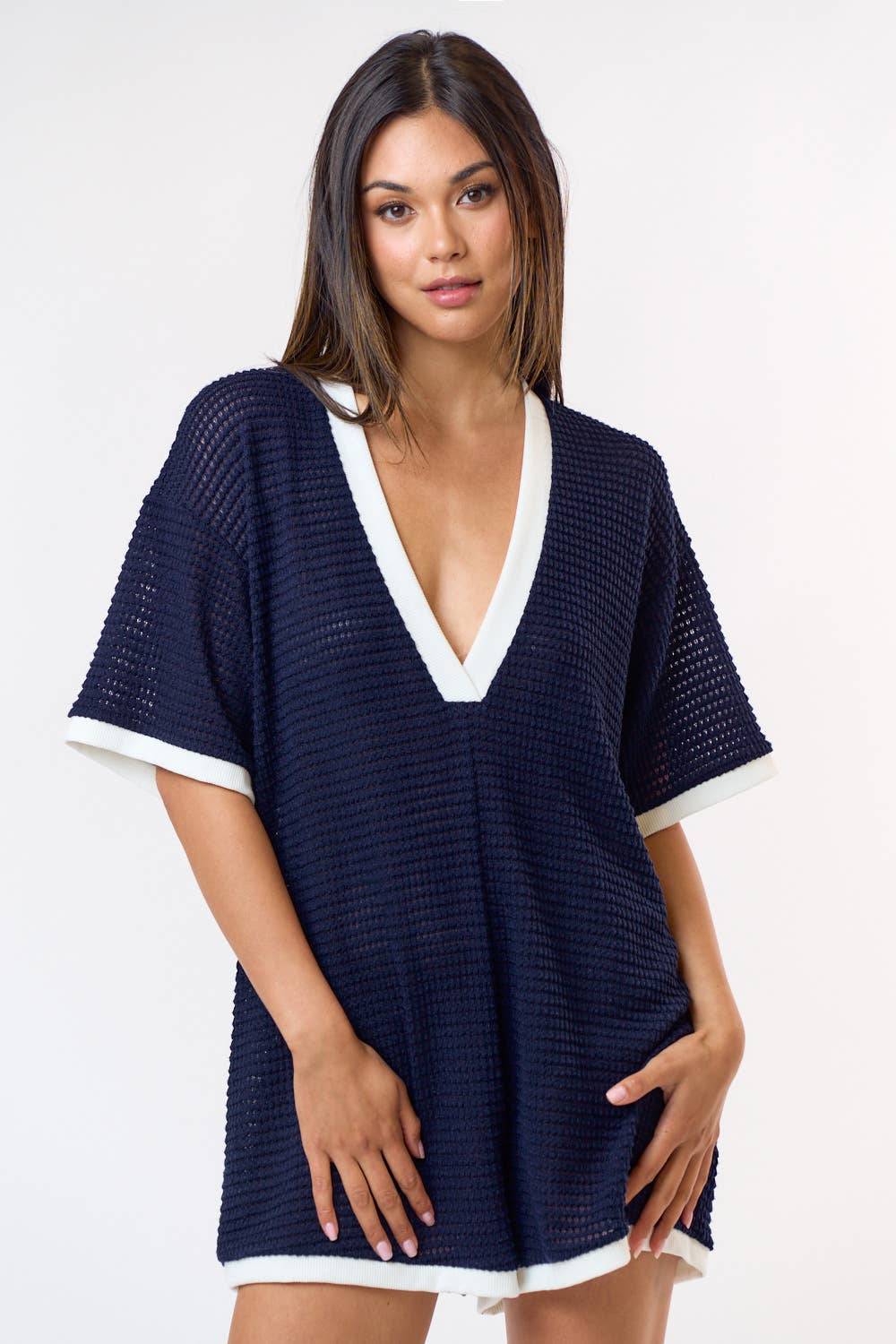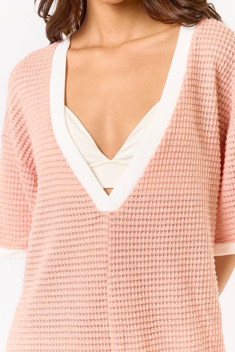 CROCHET OPEN KNIT CONTRAST DEEP V-NECK ROMPER