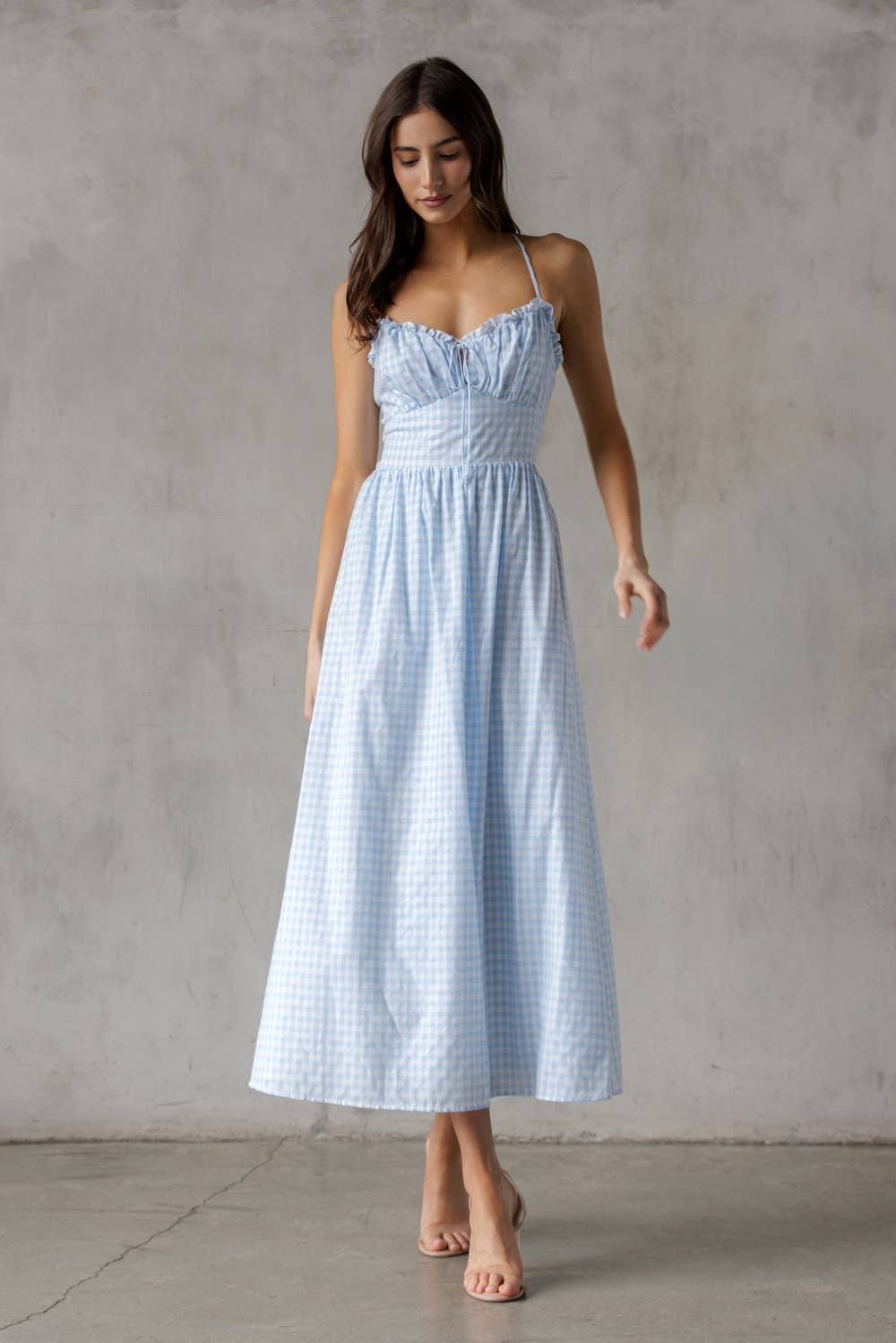 Lightweight cotton fabric with a blue and white gingham pattern - Sweetheart neckline with delicate ruffle trim along the bust - Adjustable halter-style spaghetti straps with a tie-front detail - Open-back design with crisscross straps and an adjustable tie closure - Fitted bodice that flares into a flowy A-line maxi skirt