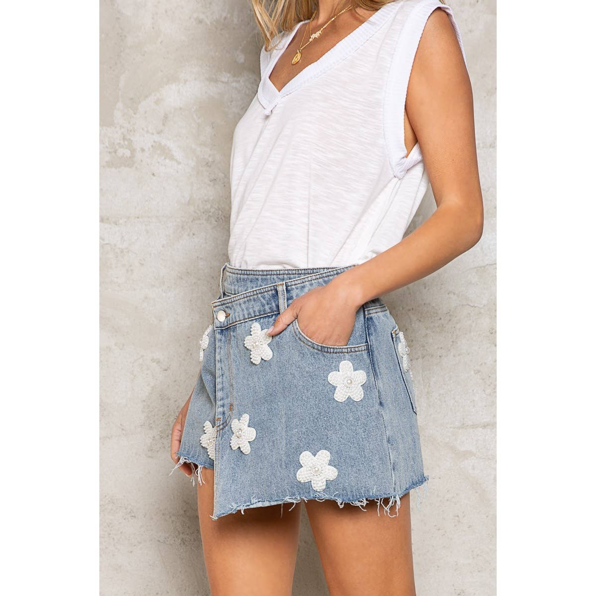 Designed in wrapped short pants with beaded patch detailing, and raw edge