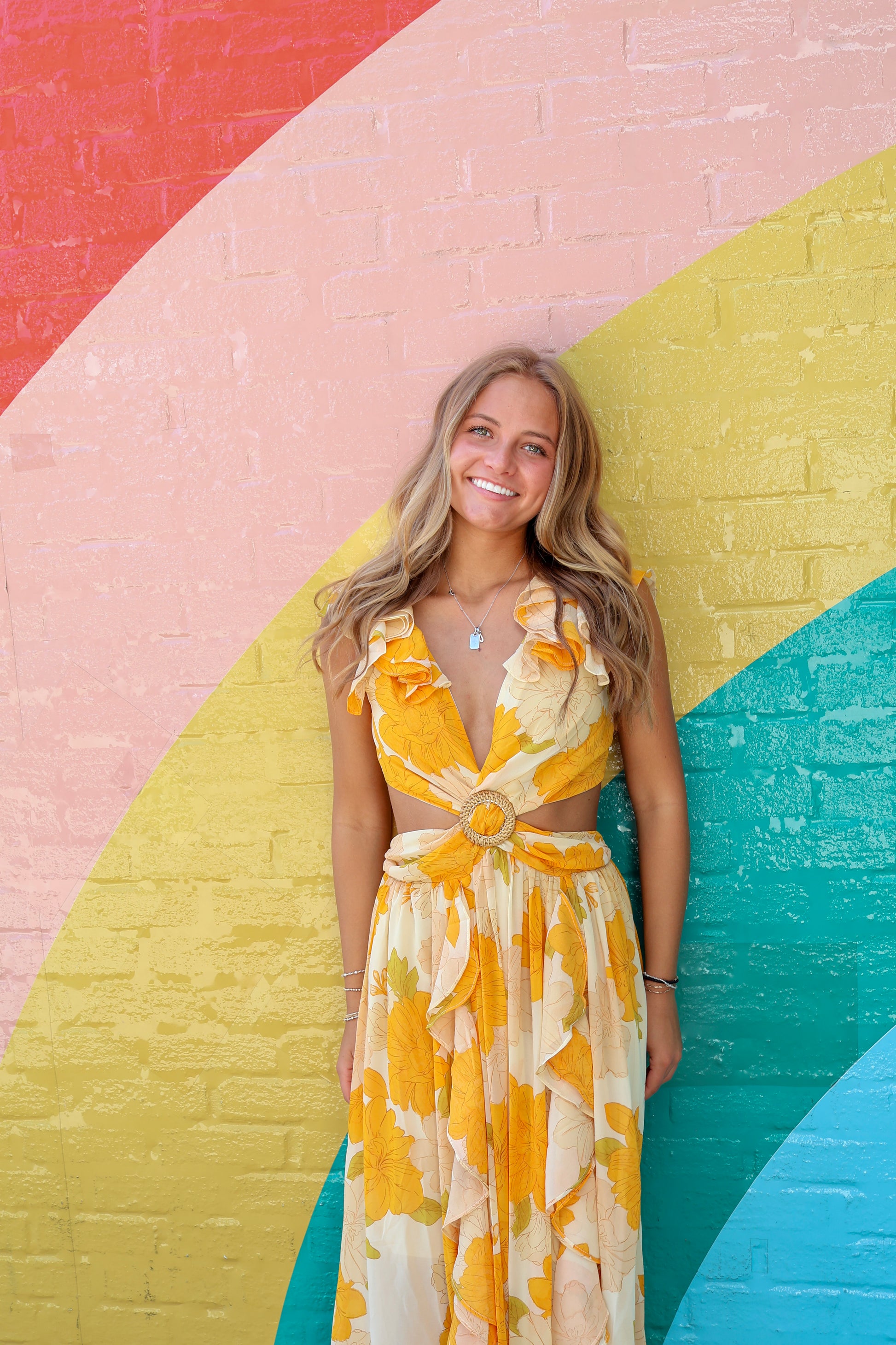 Floral print maxi dress with romantic ruffles and cutout detail. Model is 5'7" and wearing size Small.