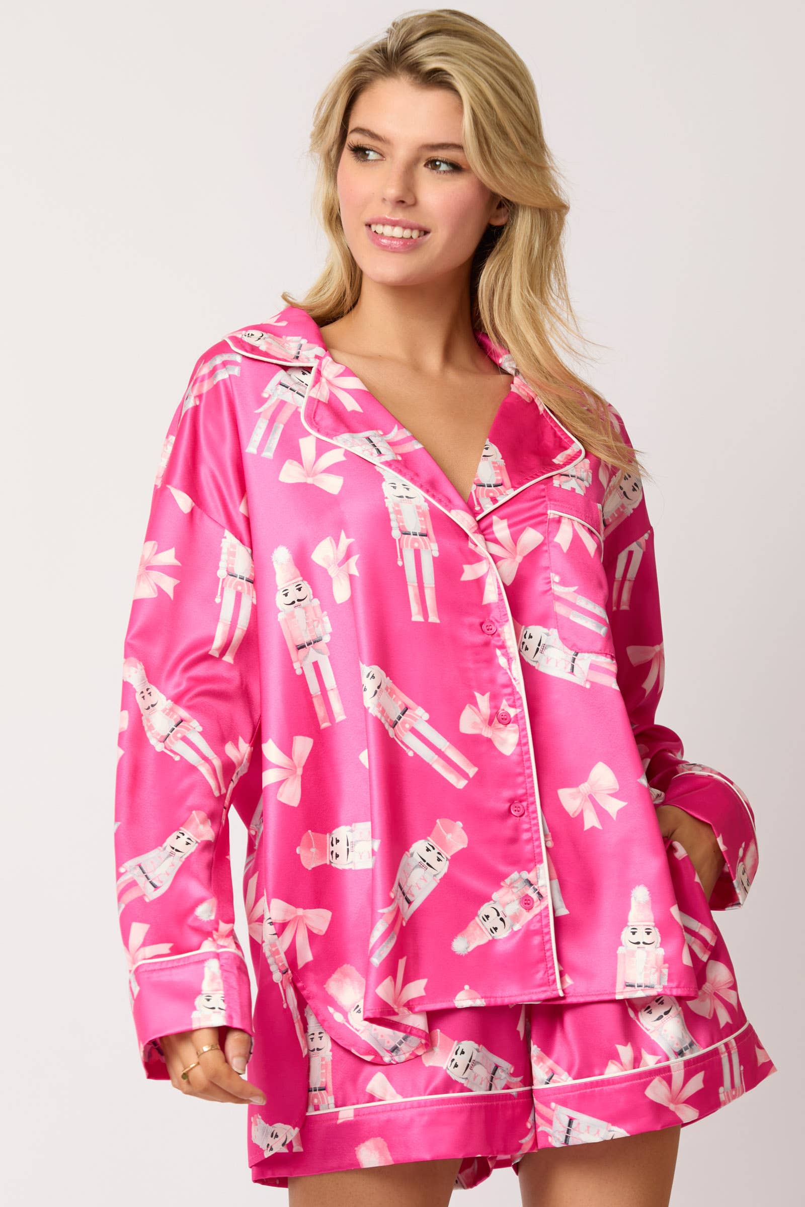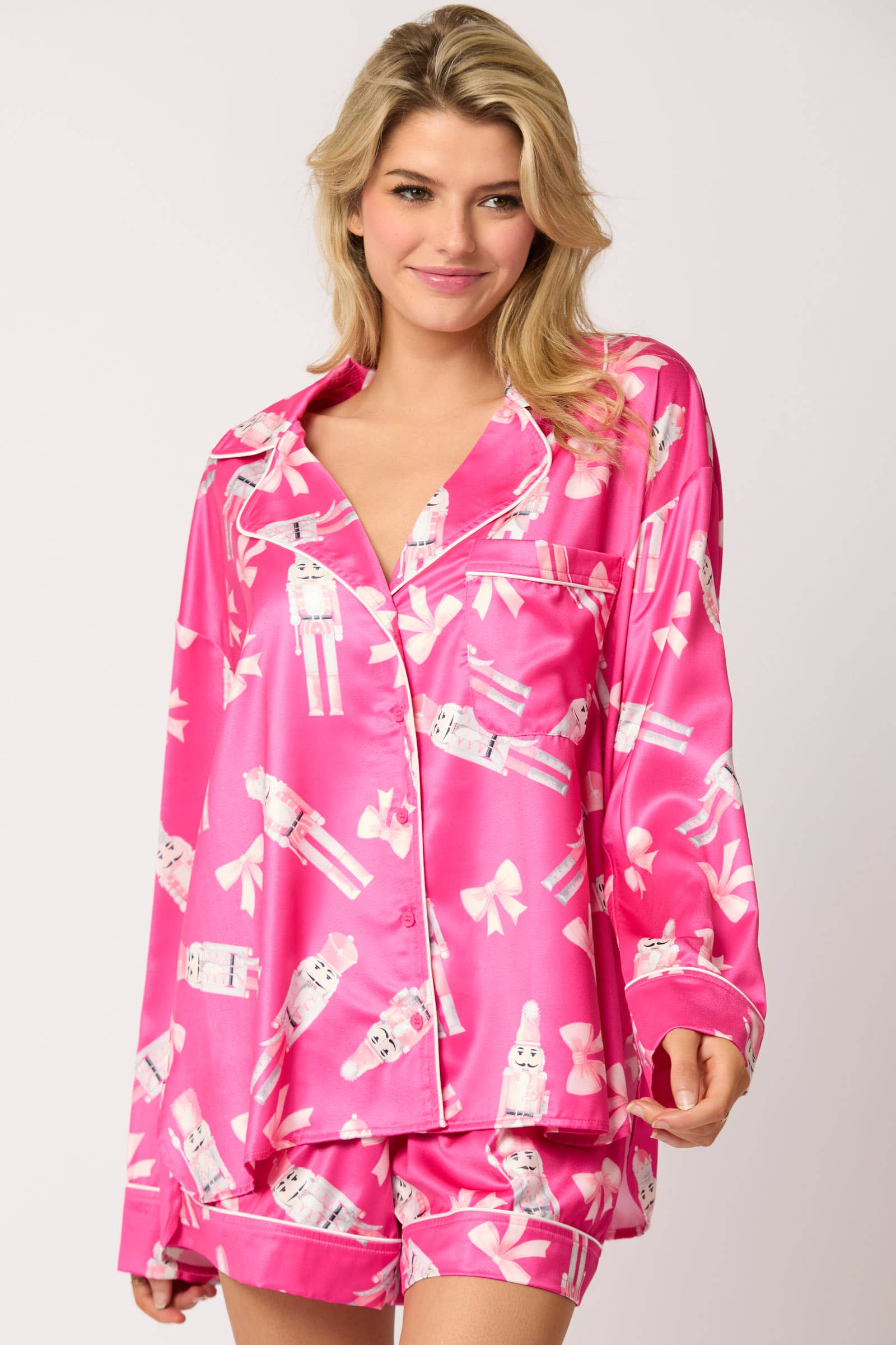 Pink Satin Nutcracker & Bow Print Pajama Set