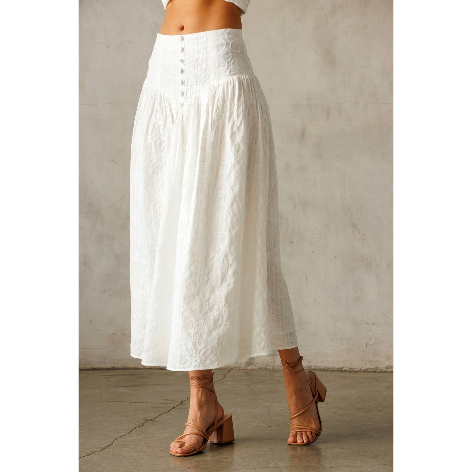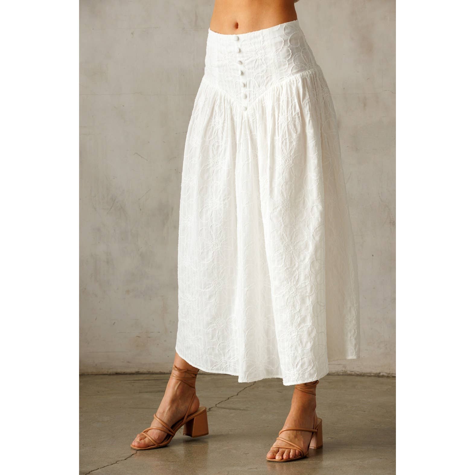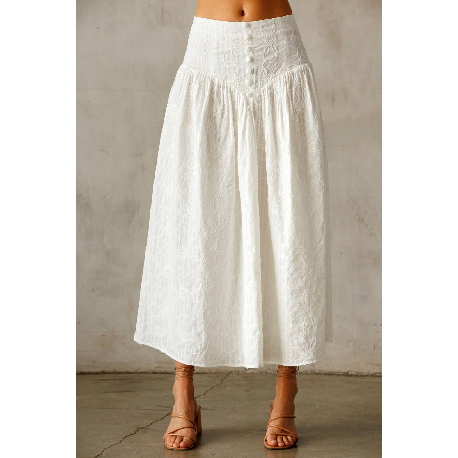This skirt embodies elegance and charm with its intricate embroidery and flowy silhouette. Crafted from delicate fabric featuring an all-over embroidered floral pattern, it adds a touch of sophistication to any outfit. The high-rise waist is accentuated with subtle button detailing and a structured waistband, transitioning into soft gathers for a flattering and comfortable fit.