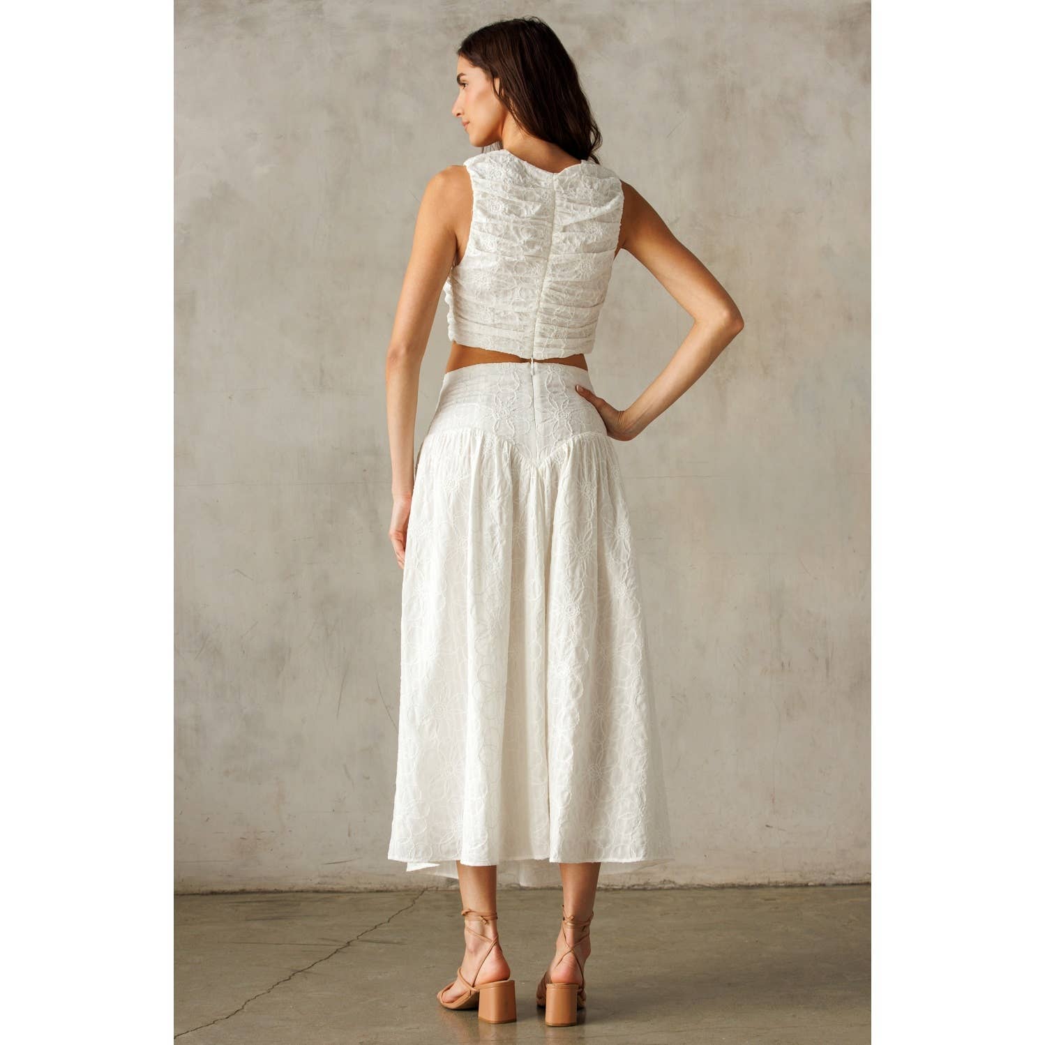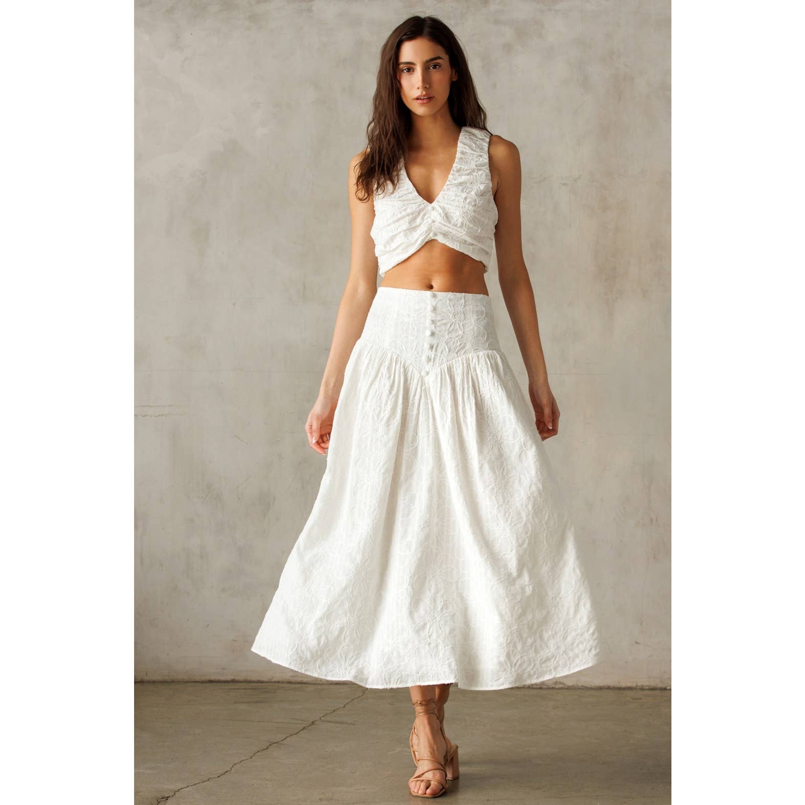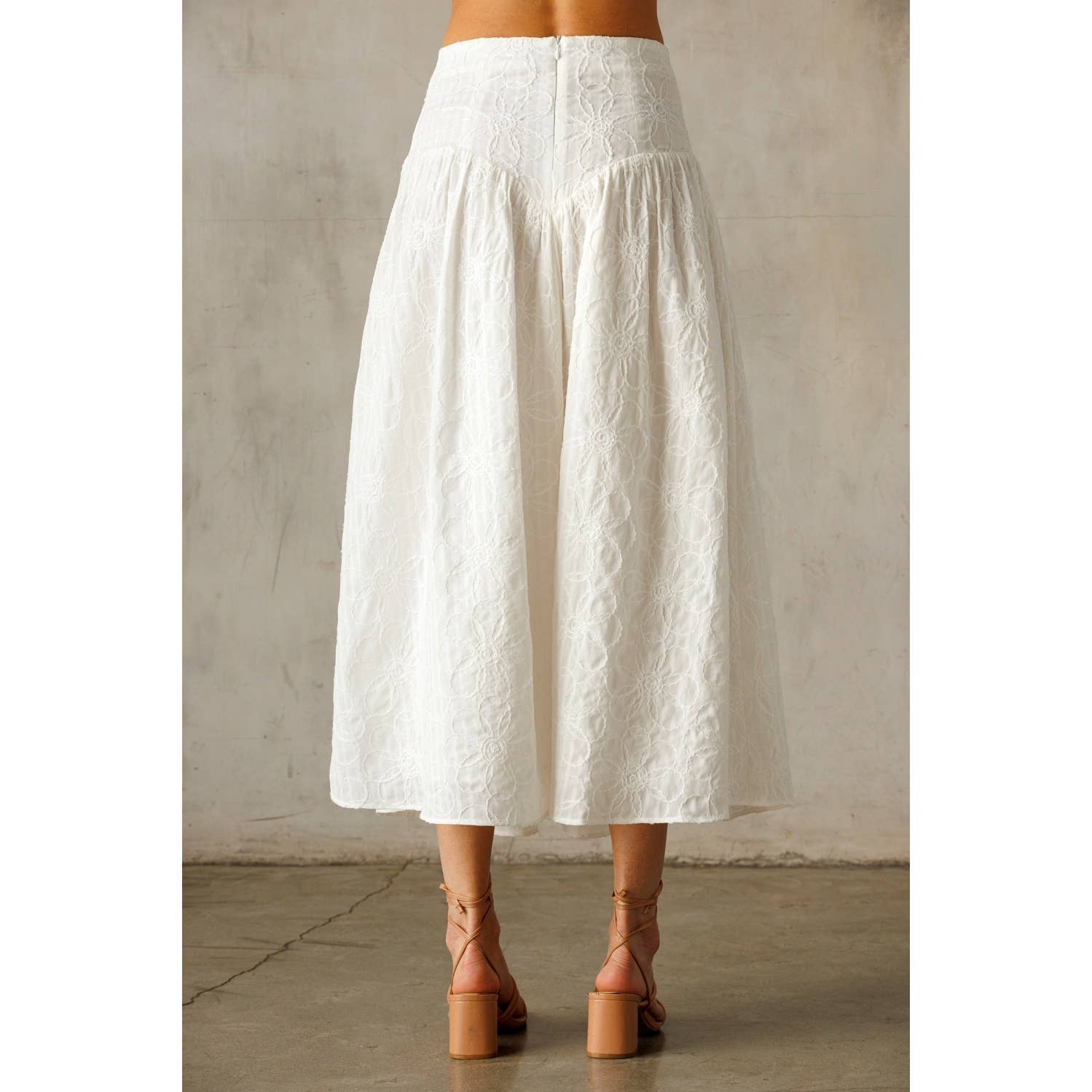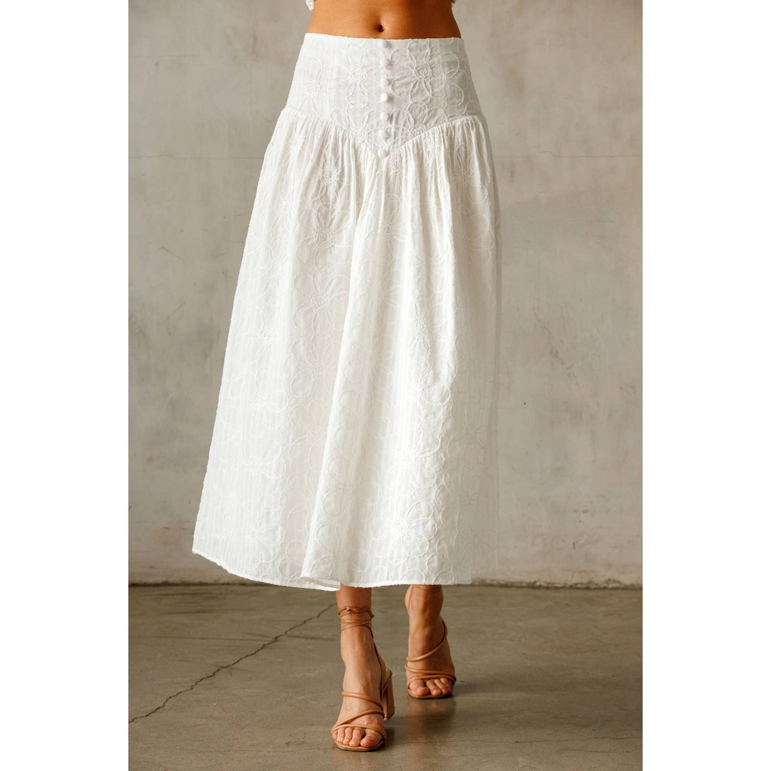 This skirt embodies elegance and charm with its intricate embroidery and flowy silhouette. Crafted from delicate fabric featuring an all-over embroidered floral pattern, it adds a touch of sophistication to any outfit. The high-rise waist is accentuated with subtle button detailing and a structured waistband, transitioning into soft gathers for a flattering and comfortable fit.