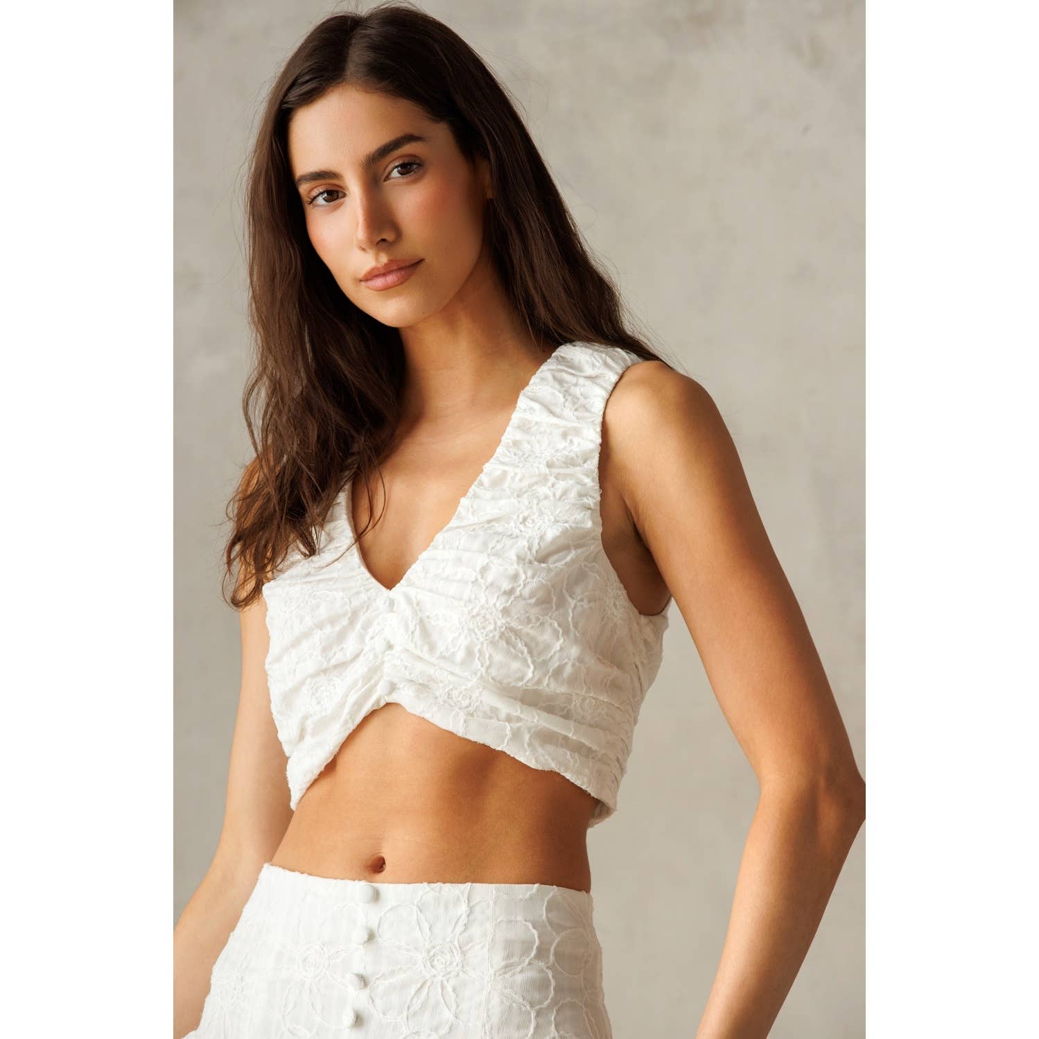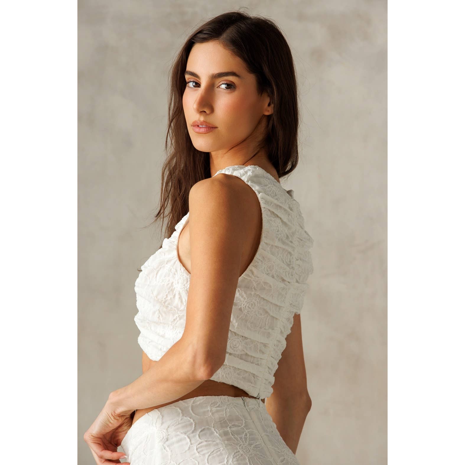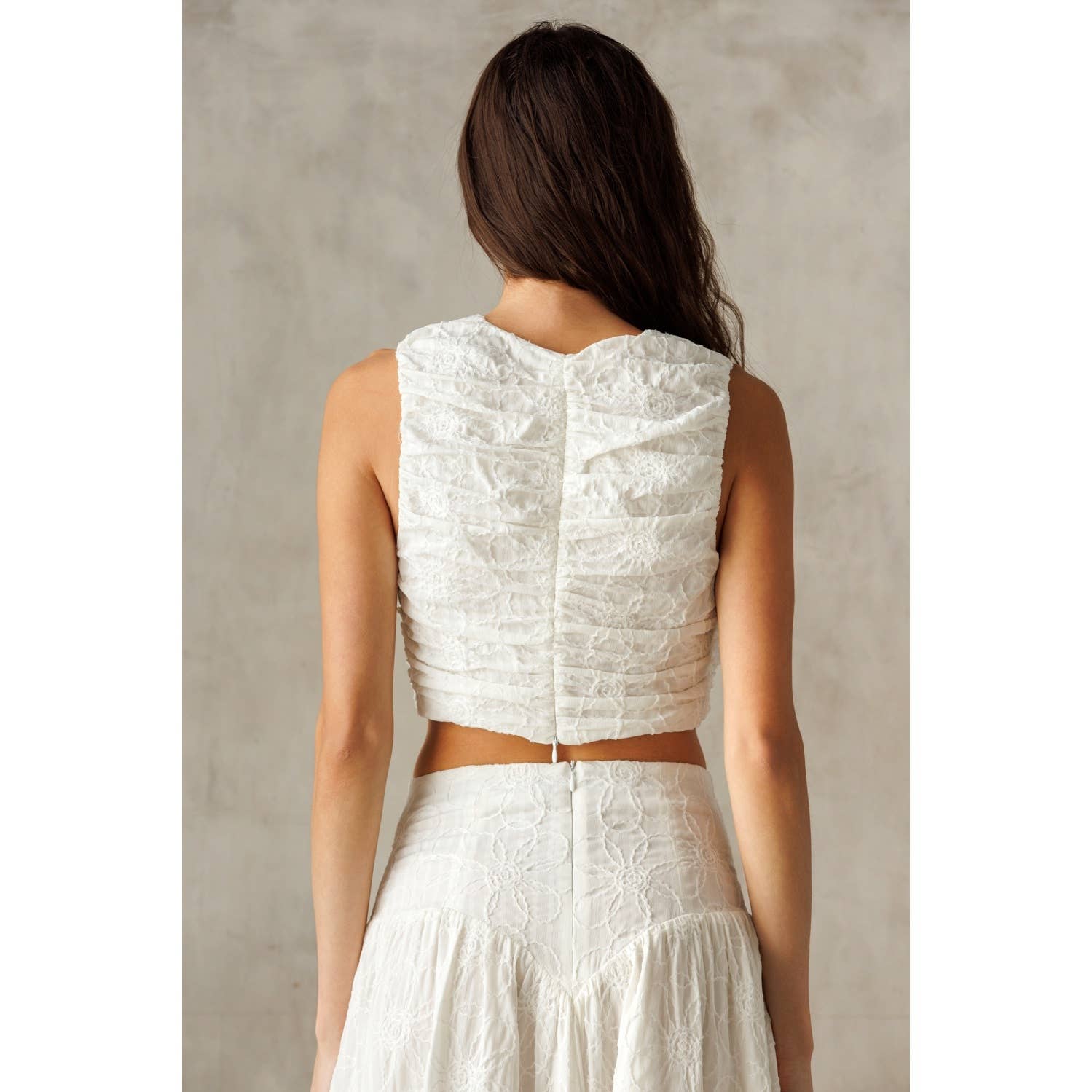 This cropped top exudes charm with its delicate ruched texture and flattering V-neckline. Crafted from soft, lightweight fabric, it features a sleeveless design for a breezy, modern look. The back zipper ensures ease of wear while maintaining a sleek silhouette.