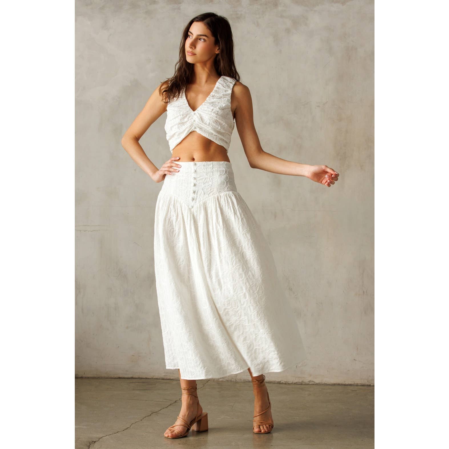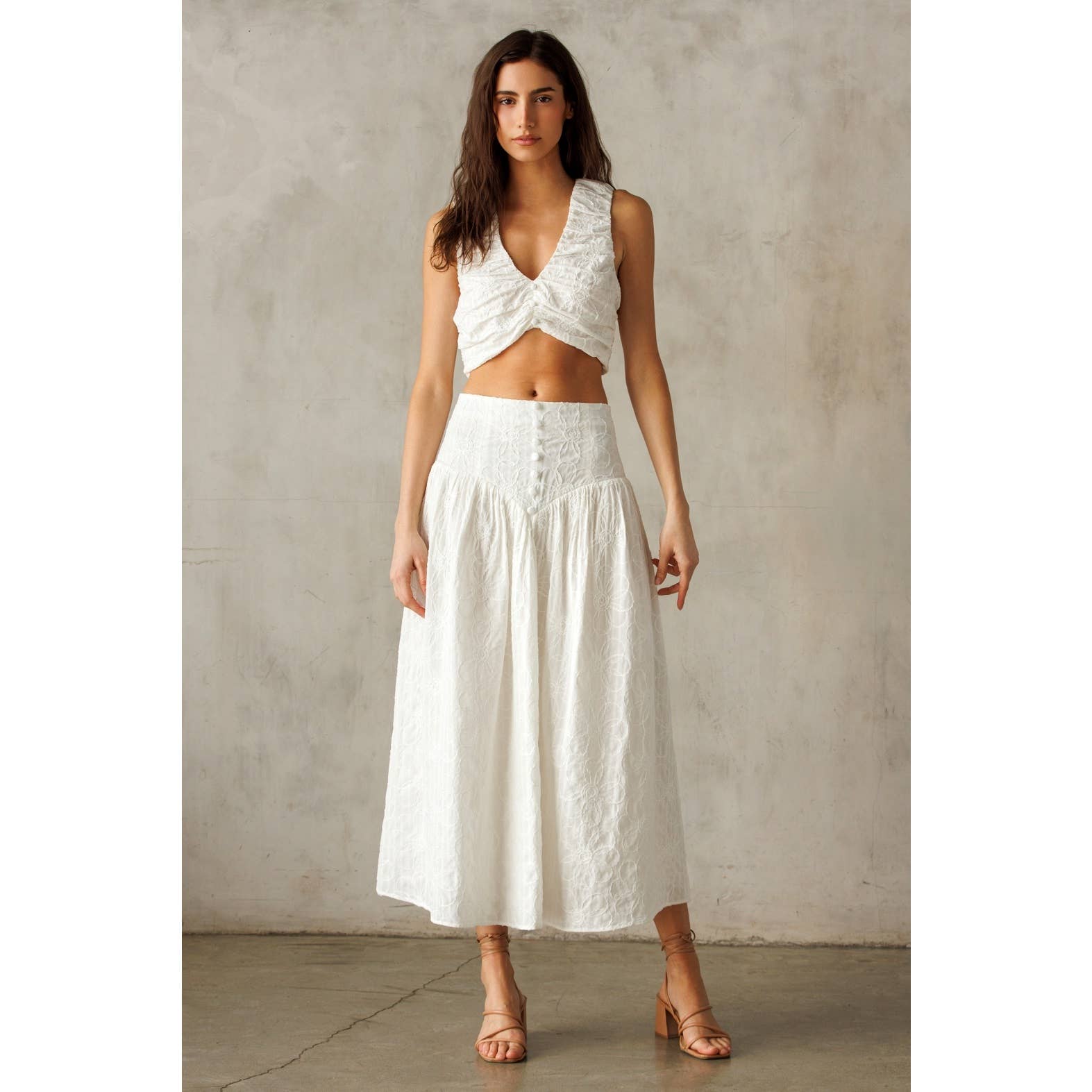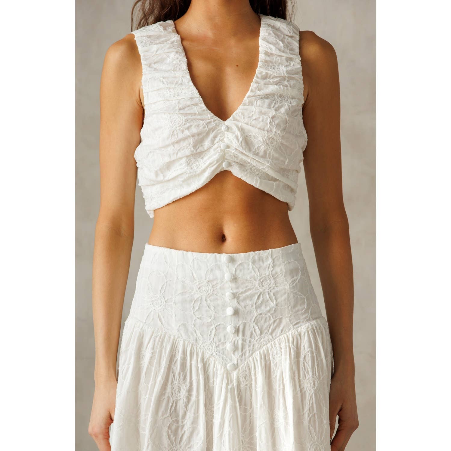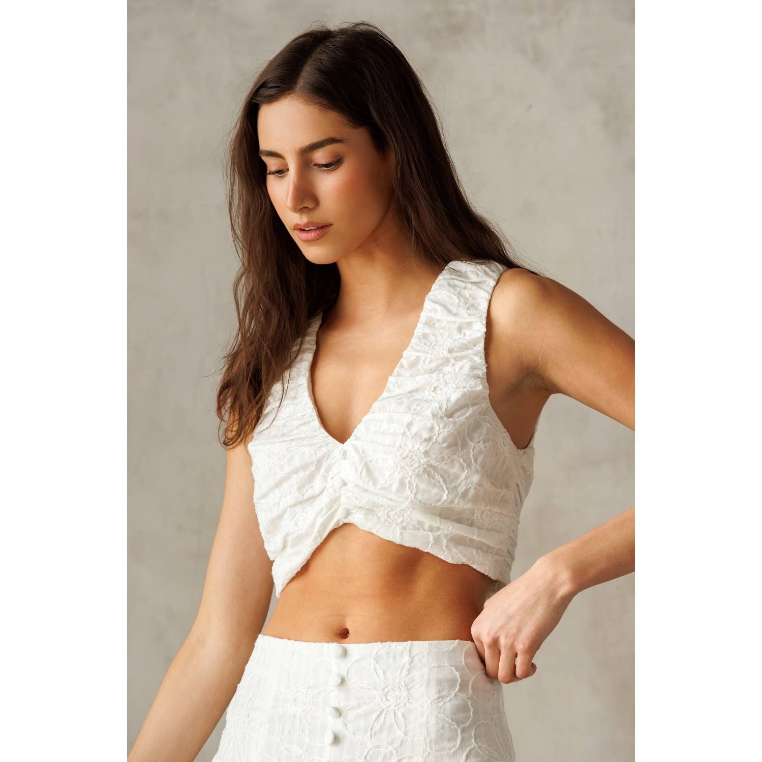 This cropped top exudes charm with its delicate ruched texture and flattering V-neckline. Crafted from soft, lightweight fabric, it features a sleeveless design for a breezy, modern look. The back zipper ensures ease of wear while maintaining a sleek silhouette.