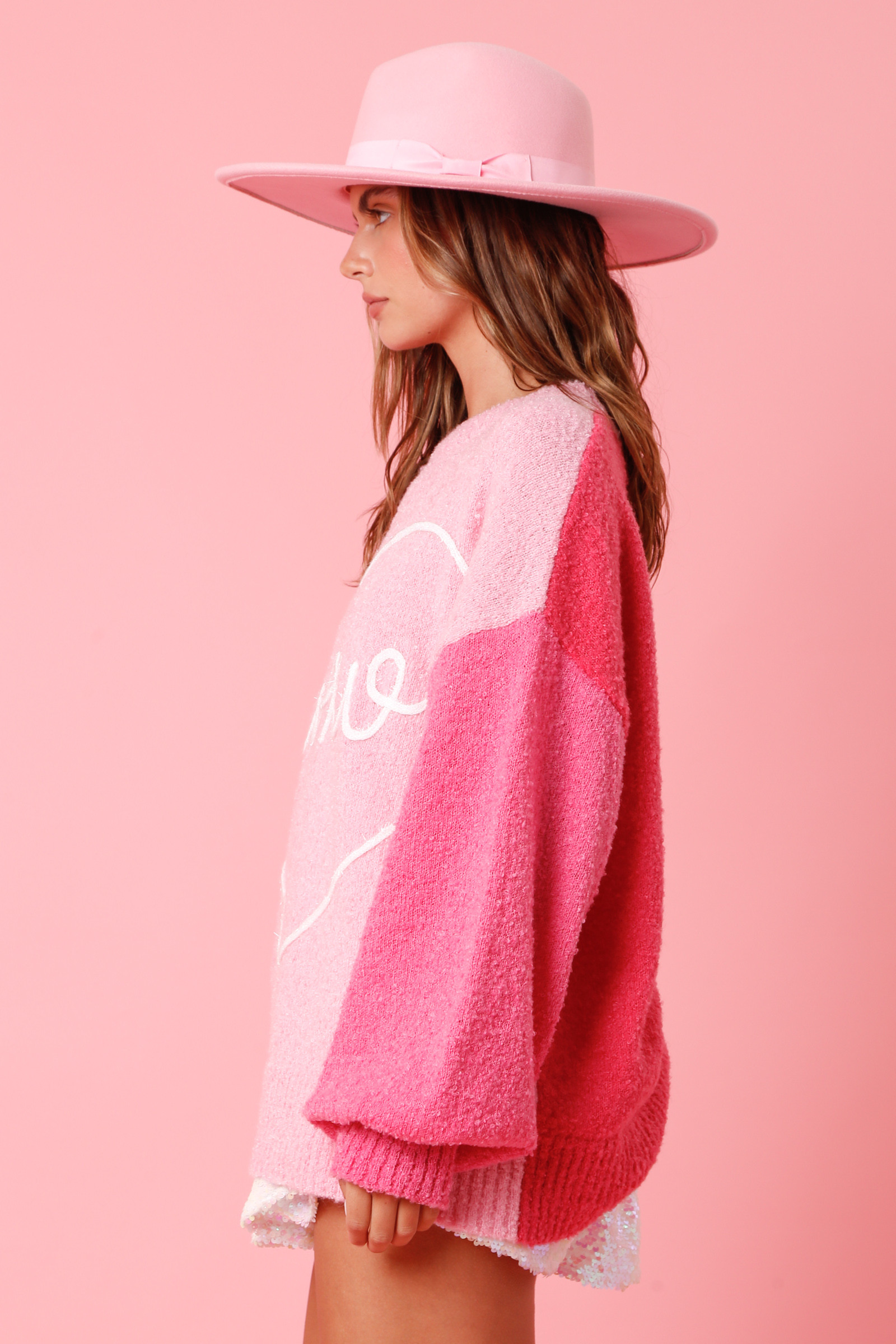 Wrap yourself in cozy charm with our XOXO Heart Knit Sweater. Designed in dreamy shades of pink with a soft ombré effect, this fuzzy knit features a hand-drawn heart outline and playful “XOXO” detail across the front. The relaxed fit and plush texture make it perfect for effortless styling, whether you’re dressing it up with sequins or keeping it casual with denim.